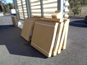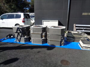 物が落下しても床に傷が付かない様にブルーシートとコンパネを用いてしっかりと養生しました。