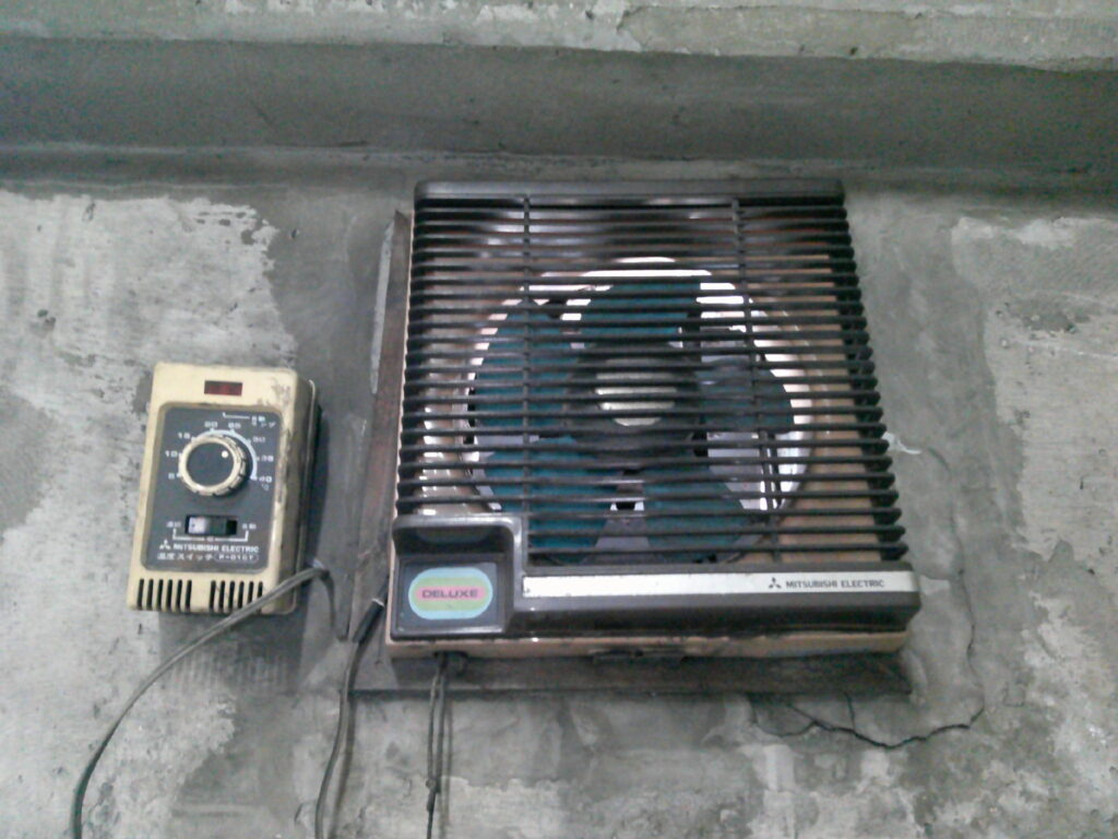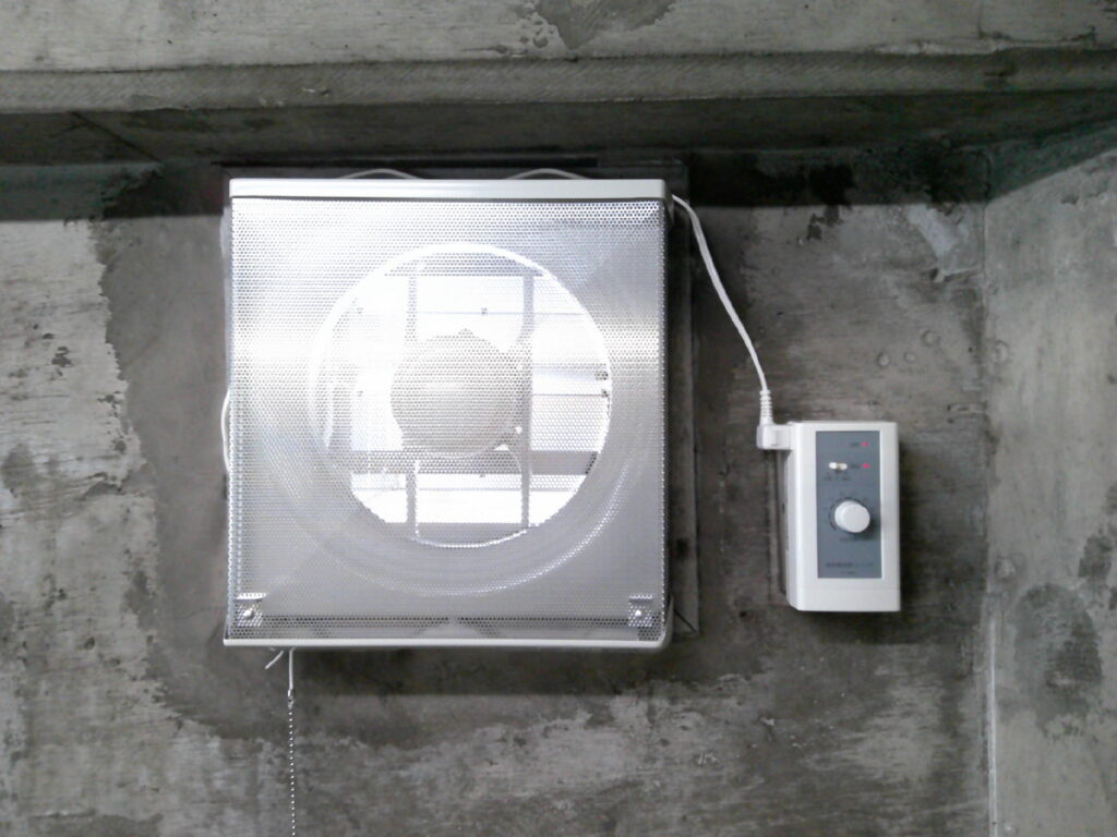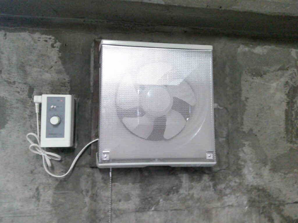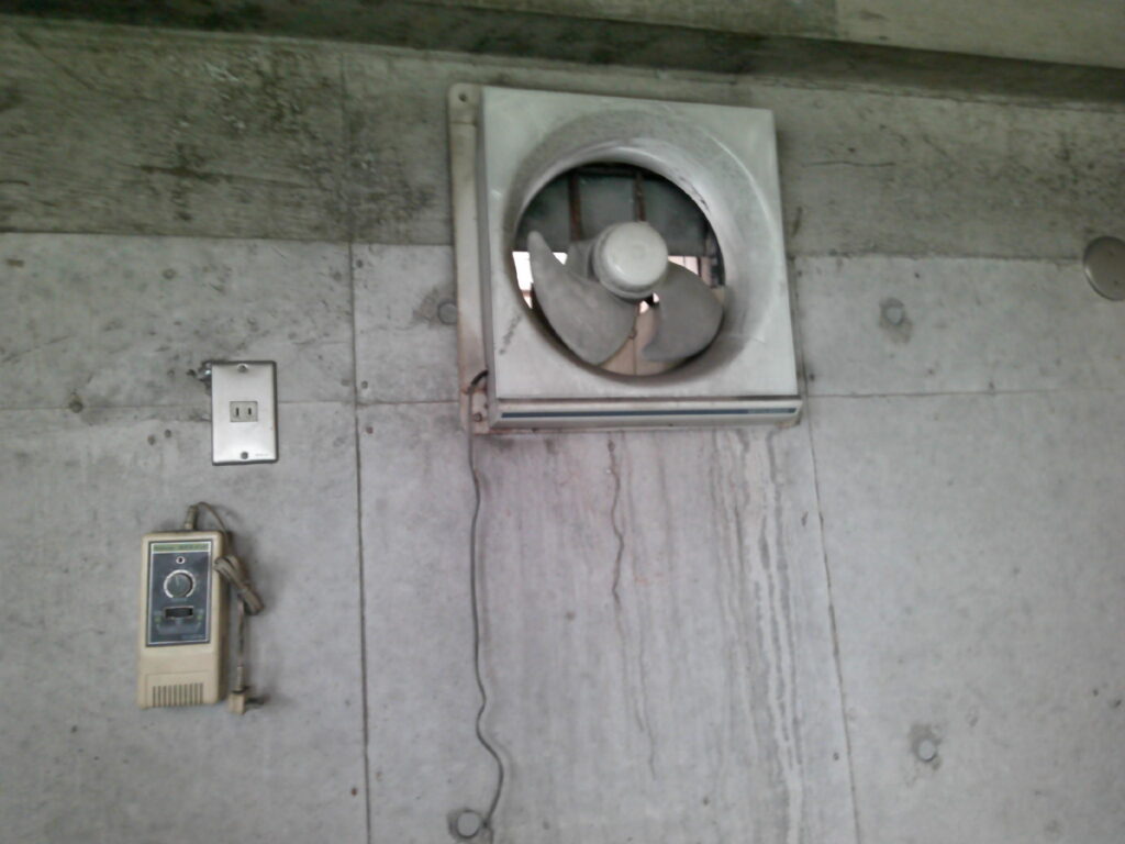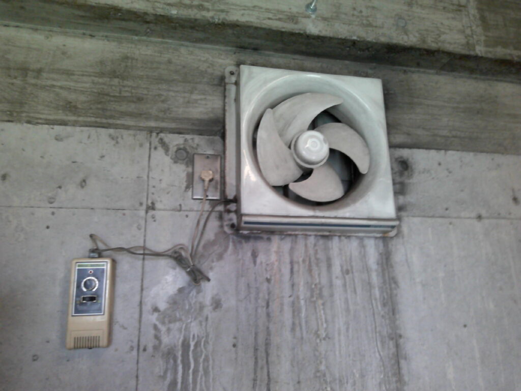 エレベーター機械室内の換気扇が経年劣化していた為、交換する運びとなりました。本件の工事において特に留意した点は安全です。エレベーター機械室内には、エレベーターを昇降させるモーター及びリールが設置されており定期的に回転動作しています。そちらに巻き込まれた場合は死亡災害となります。その為、作業前にモーター及びリール部に囲いを作り、手・足・人並びに工具等が落下しても大丈夫な様安全対策を施しました。安全対策をしていても作業中は神経ピリピリです!!事故無く安全に工事を完了する事ができました。