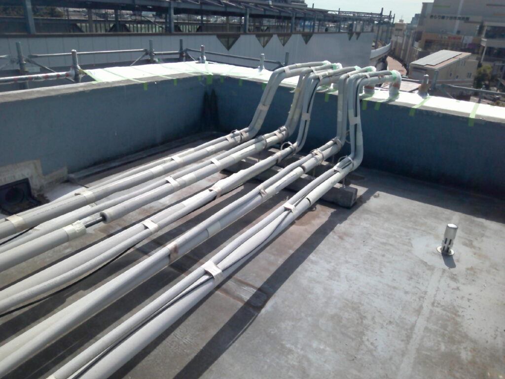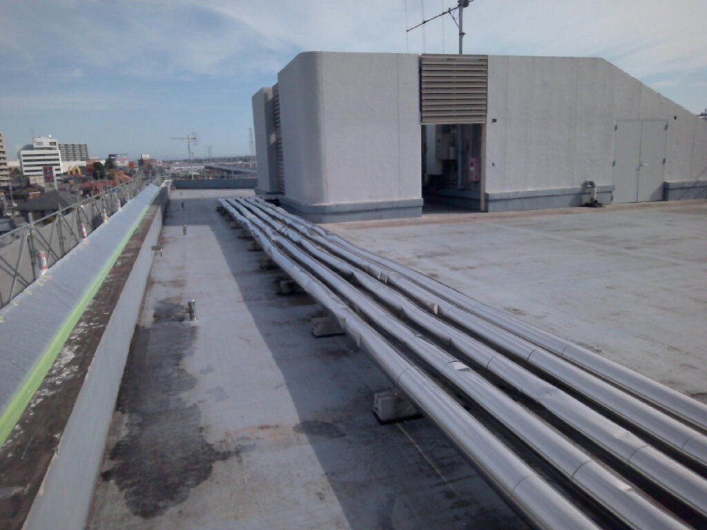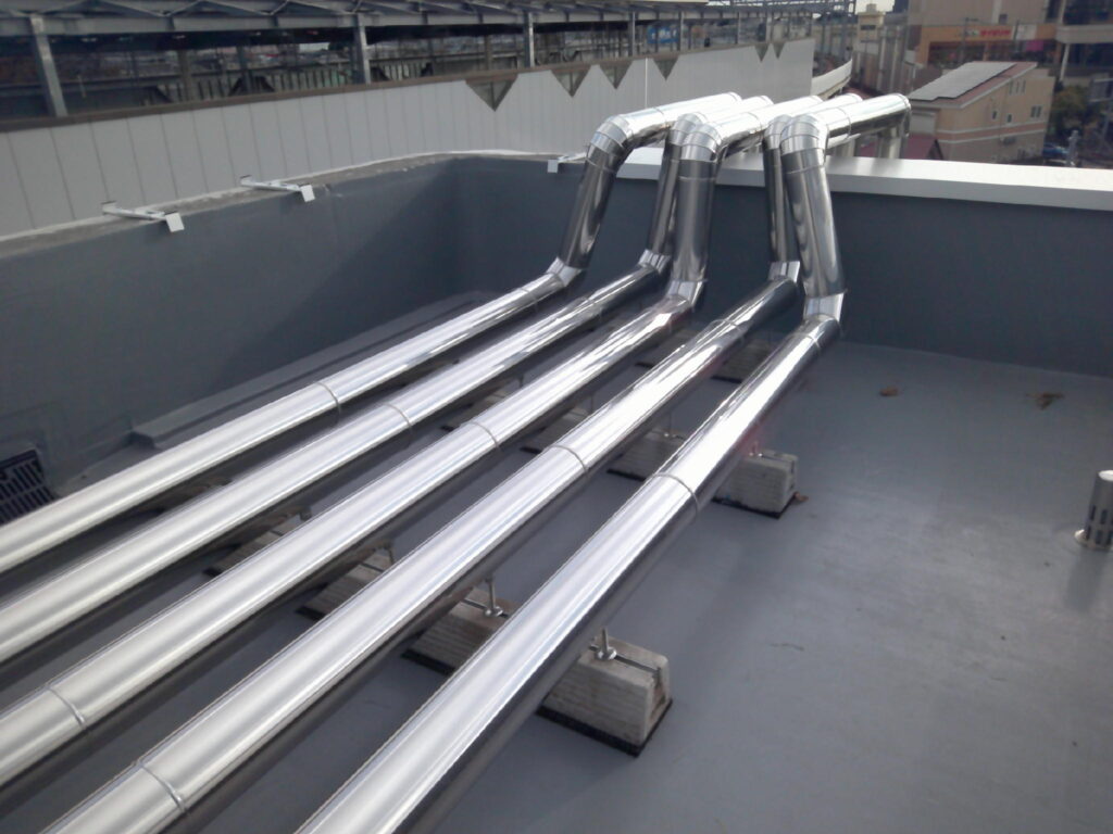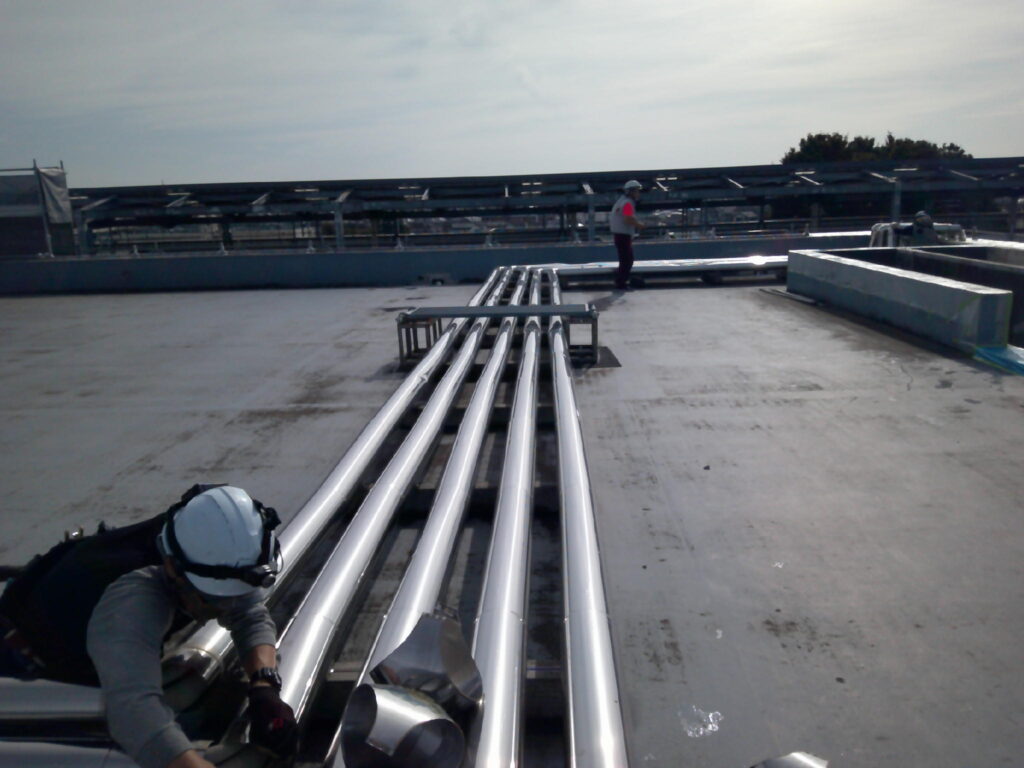 この度、全面的な外壁塗装工事と防水工事・一部内装改修工事に伴い、空調設備工事・換気設備工事の御依頼を頂戴致しました。内訳は屋上のステンレスラッキング全交換・各階男女トイレの角ダクト交換・空調機械室内大型給気ダクトの加重補強工事・1階業務用エアコンの入替え工事並びに冷媒配管・ドレン配管交換工事・室外機の一次撤去及び復旧工事でした。特に留意した点は品質です。本件は公共工事であった為、市の指定する品質施工基準に満たしている事を特に留意しました。工事が終わってから基準未満なのでやり直し!!では笑えませんから。皆様と入念なお打ち合わせと作業進捗により問題なく工事を完了させる事ができました。