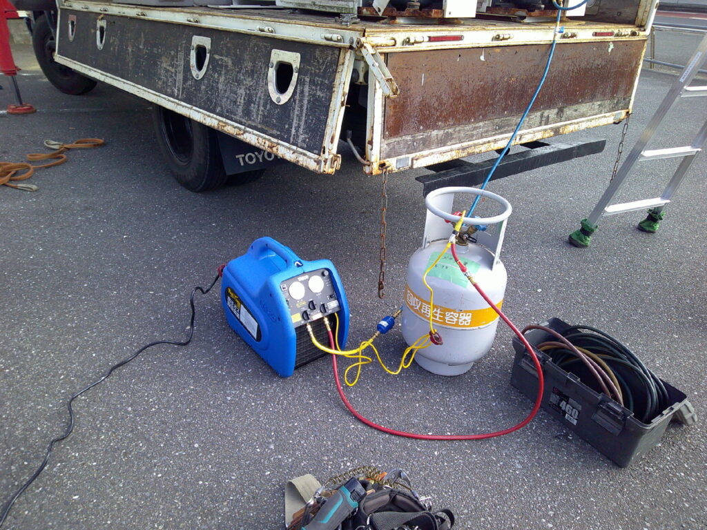 経年により基板が故障し、室内外通信異常が出て空調機が御使用できなくなっていました。修理部品の製造及び販売が終了してしまった為、修理できないのでこの度更新する運びとなりました。作業上特に留意した点は安全です。建物の屋根上に室外機が設置されていた為、小型移動式クレーンを用いての室外機楊重作業となりました。アウトリガー張り出し・車両水平設置・ブームの傾斜角度が安全範囲内である事に特に注意しました。安全は全てに優先しますからね!室外機架台もサビサビになっていたので、防錆塗装を施しておきました。事故無く・問題なく工事を完了させる事ができました。